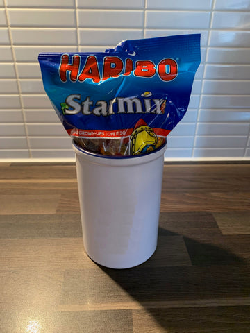 High quality ceramic Pen Pot with your child's drawing, name and logo of their school if required, plus: Large Bag of Haribo Sweets and Gift Wrap